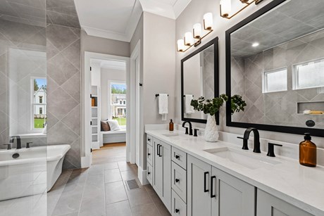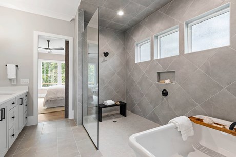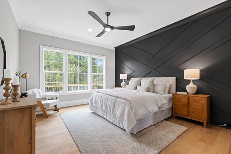 The first-floor primary suite serves as a serene retreat with a luxurious bathroom and walk-in closet, providing privacy and convenience away from the upstairs bedrooms.